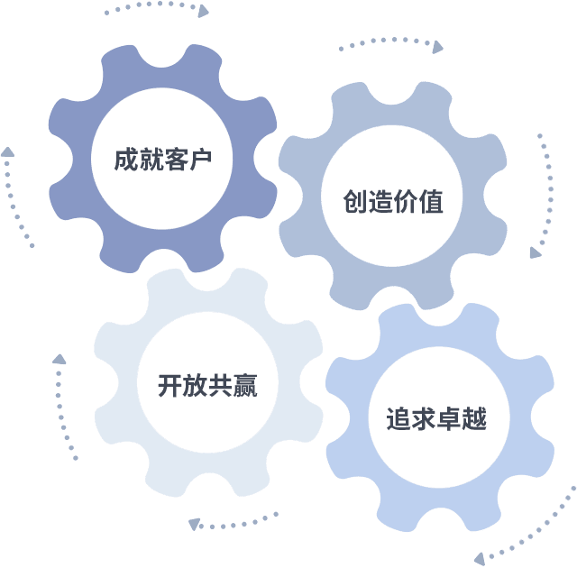 成就客户是一切决策的出发点,,,创造价值是衡量所有工作的标准,,,,追求卓越是我们做事做人的态度,,开放共赢是我们的格局也是最终的结果。。价值观的齿轮环环相扣,,,推动着组织里的每个人不断向前。。